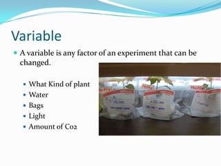 This document provides instructions and background information for conducting several science experiments. It discusses the key components of experiments including variables (factors that can be changed), manipulated variables (what is changed by the experimenter), responding variables (what is observed and measured), and control variables (factors kept the same). It then provides details on setting up and conducting experiments to test how different types of batteries affect flashlight brightness, what type of coffee cup keeps coffee warmest, and how light level, light color, and carbon dioxide affect the rate of photosynthesis in elodea plants. Students are instructed to make hypotheses, collect data, and analyze results.