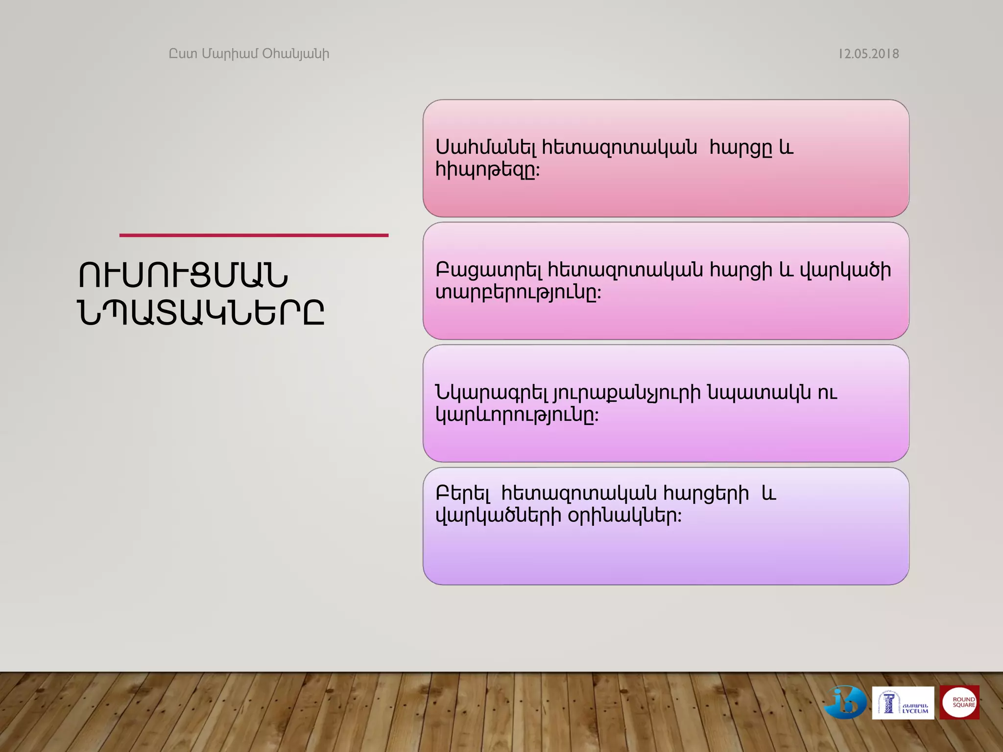 Այս սահիկաշարը ստեղծվել է ավագ դպրոցի սաների և ուսանողների համար, որոնք արժևորում են գիտության մեջ հետազոտական աշխատանքի կարևորությունը: Այն հնարավորություն է տալիս առավել լավ պատկերացնել ՙՙվարկած՞՞ և ՙՙփոփոխականներ՞՞ հասկացույունները և հետազոտական հարց, վարկած ձևակերպելու ուղիները: