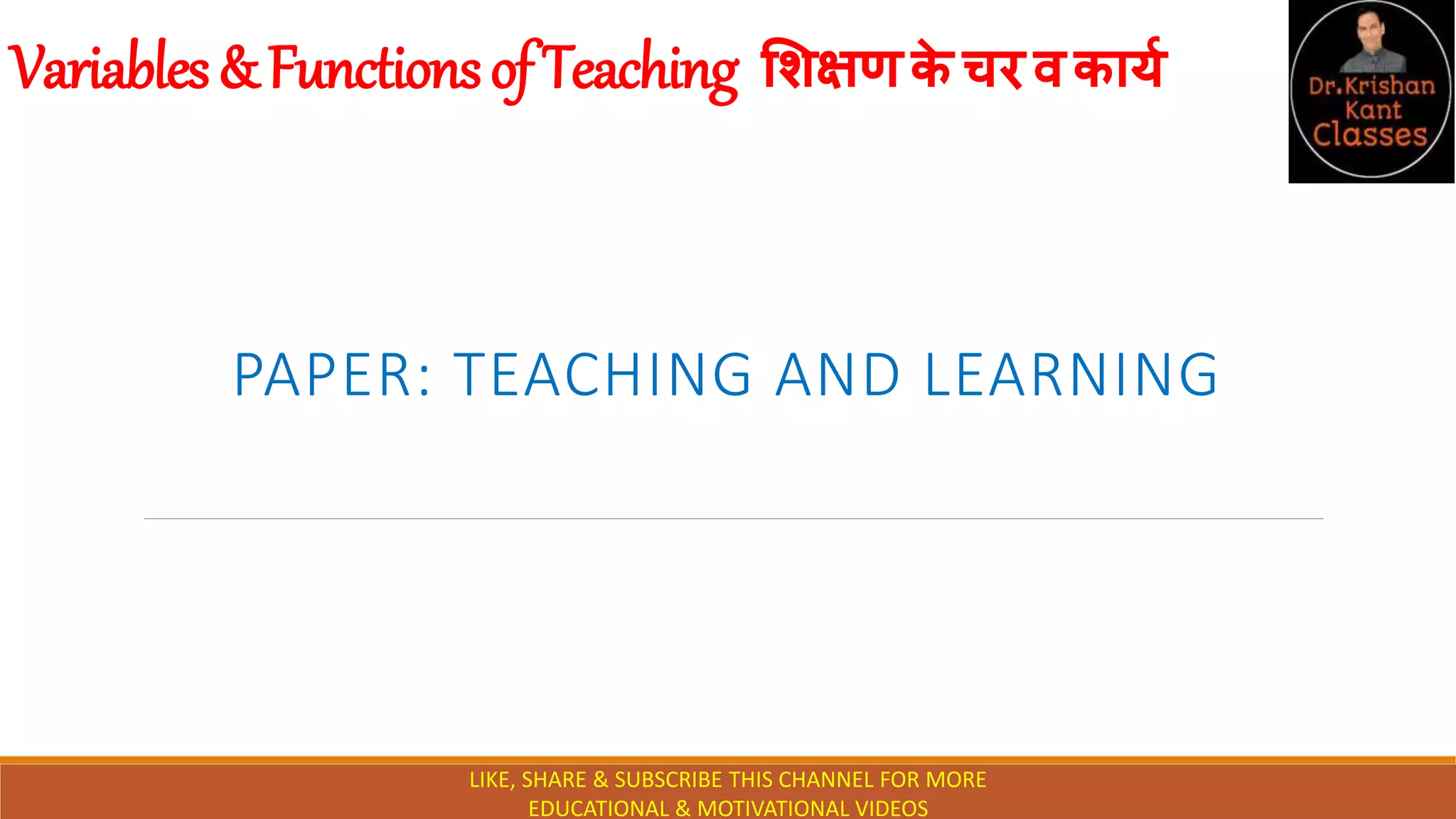 The document discusses the variables and functions of teaching. It identifies the key variables in teaching as the teacher, student, textbooks/content, instructional methods, instructional aids, and classroom environment. These variables can be classified as independent, dependent, or intervening. The teacher acts as the independent variable, the student is the dependent variable, and the content/strategy of presentation are intervening variables. The main functions of teaching variables are diagnostic (identifying student needs), prescriptive (selecting appropriate content and methods), and evaluative (assessing outcomes). Together, the variables and their functions work to create an effective teaching and learning process.