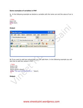 PHP variables are used to store values and information. Variables must start with a $ sign and can be of different data types including integers, floats, strings, arrays and objects. PHP is a loosely typed language so variables do not need to be declared and their type is determined by the value. Examples show how to assign values to variables, perform operations on them, get string lengths and positions, and demonstrate variable scoping using the $$ syntax.