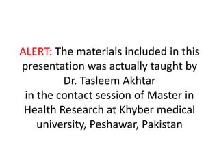 This document discusses variables, hypotheses, study types, and validity/reliability in research. It defines variables as characteristics that can take different values, and categorizes them as numerical, categorical, continuous, discrete, ordinal, and nominal. Hypotheses predict relationships between factors and problems that can be tested. Study types include descriptive studies, comparative/analytical studies, experimental studies, quasi-experimental studies, and before-after studies. Validity means measurements actually assess what is intended, while reliability means repeatability of findings.