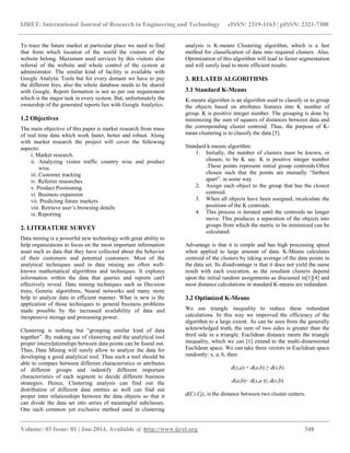 The document discusses the development of a web analytics tool, the Variance Rover System (VRS), which utilizes data mining techniques to analyze large datasets from online web visits. The primary objective of the system is to perform market research and consumer analysis, enabling companies to optimize their decision-making and business strategies. It emphasizes clustering methods, particularly the k-means algorithm, to enhance data analysis and predict customer behavior.