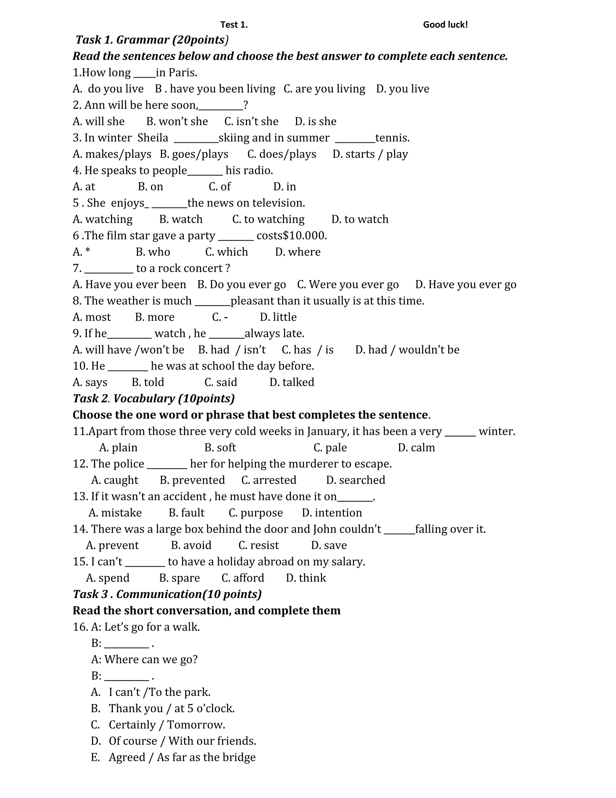 This document contains a test with multiple choice questions assessing grammar, vocabulary, reading comprehension, and English language usage. It begins with a grammar section with 10 multiple choice questions about parts of speech, verb tenses and sentence structure. This is followed by a vocabulary section with 5 multiple choice questions about word meanings. A communication section follows with 5 short conversations each with a missing line to choose from multiple options. Finally, a reading comprehension section presents a short passage and 3 multiple choice questions about details in the text. The test aims to evaluate proficiency in core areas of English language skills.