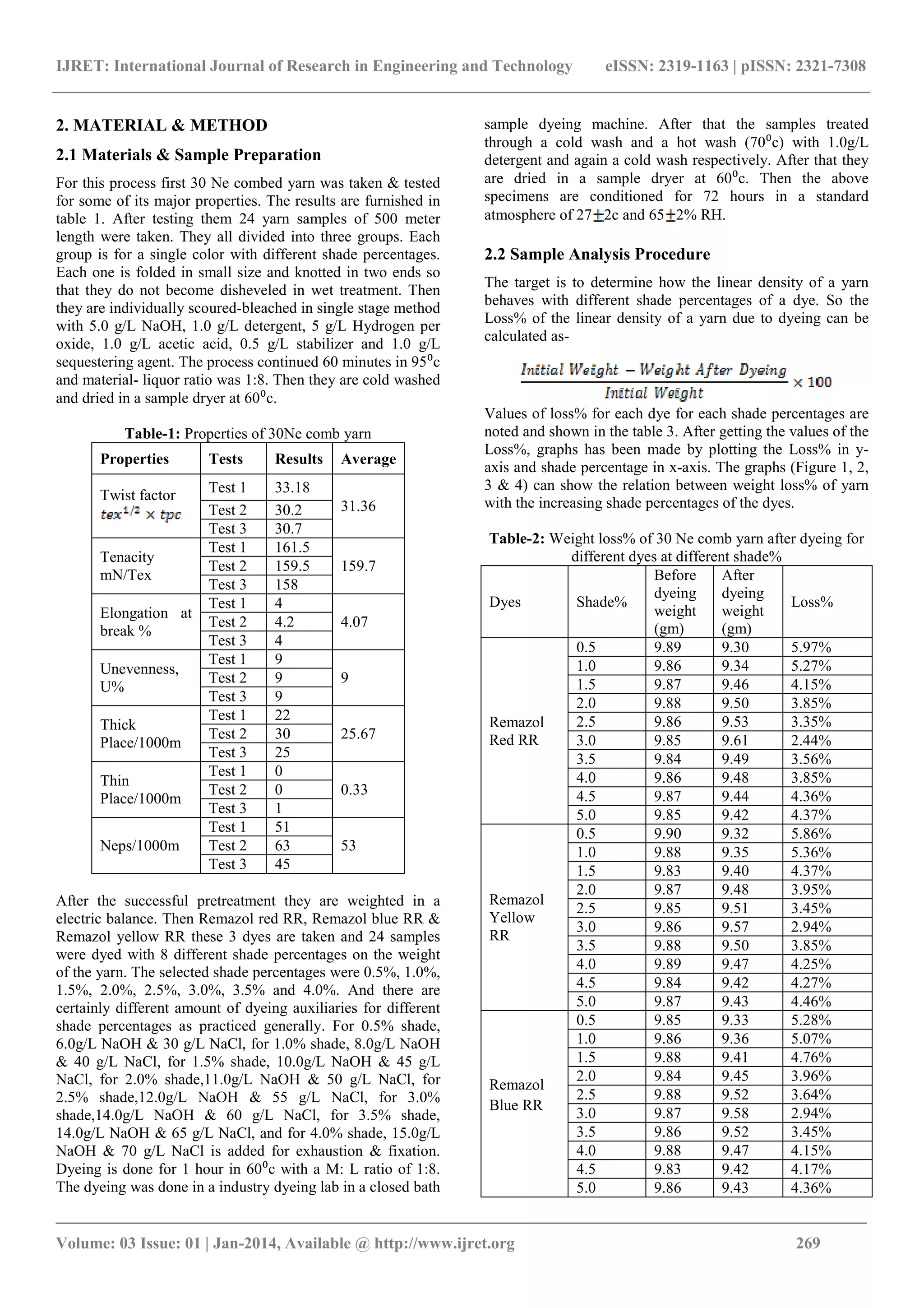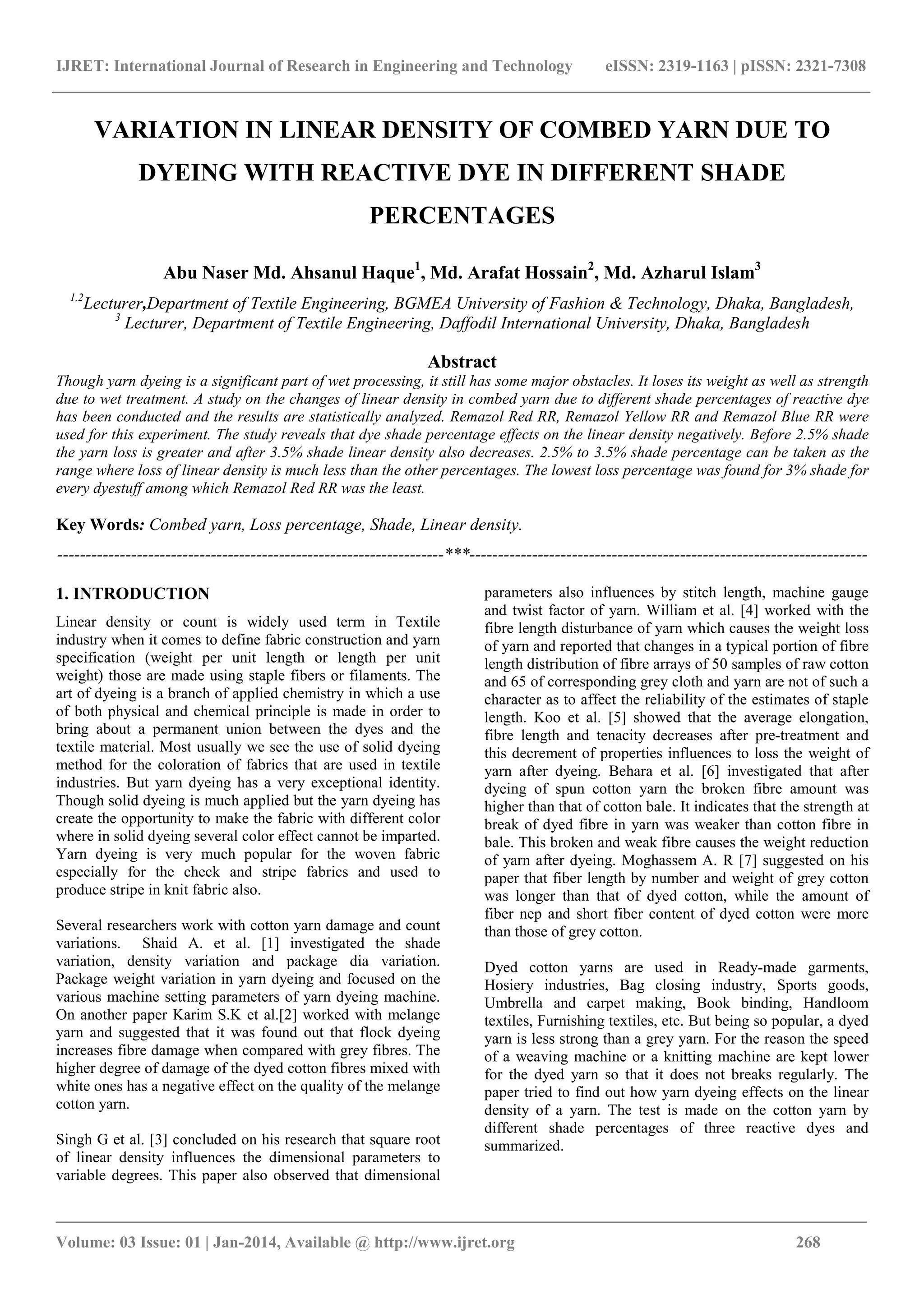 This study investigates the impact of reactive dyeing on the linear density of combed yarn, highlighting that loss of weight and strength occurs during wet treatment. Results show that while linear density loss is significant below 2.5% dye shade, it stabilizes between 2.5% and 3.5%, with 3% shade incurring the least loss. The findings suggest a 'safe zone' for dyeing yarn to maintain quality, emphasizing the need for careful chemical management outside this range.
