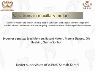 The document discusses various anatomical variations that can occur in human maxillary molars. It describes variations in the number of roots and root canals, including the presence of 5-6 roots in some cases. The shape of the crown can also vary, with some individuals having 6-7 cusps rather than the typical 4. Specific variations are described for each maxillary molar, including the potential for taurodontism, accessory roots, root fusions, and additional cusps. A variety of environmental and developmental factors are believed to influence these anatomical variations.