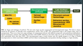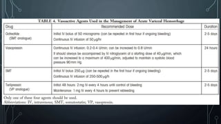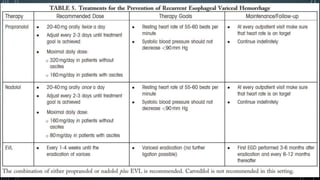 2) Management of variceal bleeding involves stabilizing the patient, performing endoscopy within 12 hours to identify varices, and administering vasoactive drugs to control bleeding along with antibiotics to prevent infection. Endoscopic variceal ligation or sclerotherapy can help stop active bleeding from varices.
