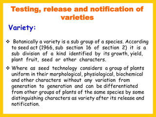 The document outlines the process of variety development, evaluation, testing, and release of new crop varieties in India, detailing the steps from the development of new strains to their eventual release and notification by the government. New varieties are tested for key attributes such as yield, disease resistance, and environmental adaptability, through a series of trials conducted over multiple locations and years. The release process involves various committees and includes comprehensive testing to ensure new varieties outperform existing ones before they are certified and made available to farmers.