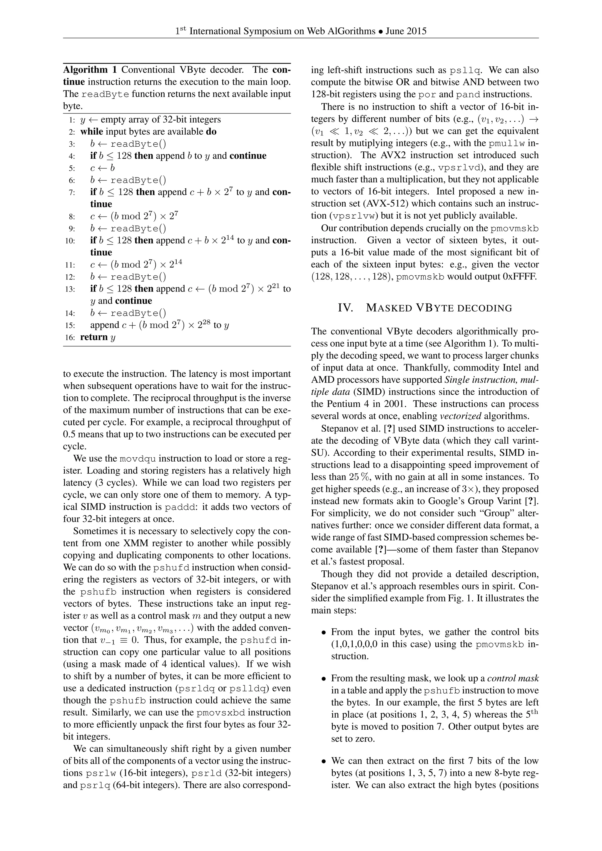 The document discusses the performance improvements of masked vbyte decoding, a method to accelerate the decoding of vbyte compressed integers, making it 2 to 4 times faster than conventional methods. The work contrasts previous attempts using SIMD instructions which yielded limited performance gains, and it outlines the algorithm for efficiently decoding a sequence of integers. The study aims to optimize the process by addressing branch mispredictions and implementing a masked approach for larger chunks of data processing.