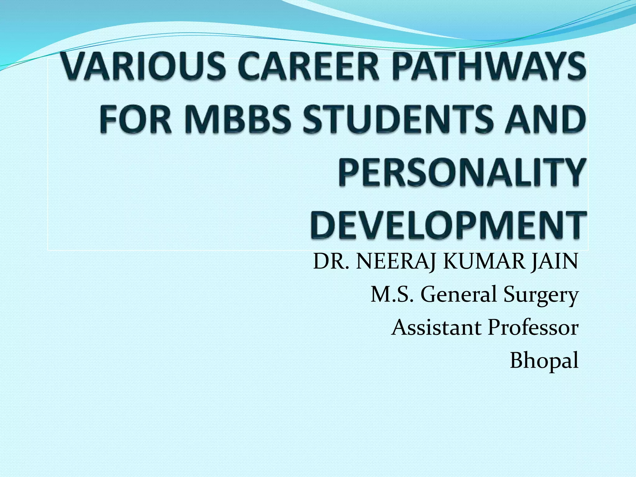This document outlines various career paths and opportunities available to MBBS graduates in India. It discusses options for pursuing postgraduate degrees like MD, MS, and DNB in various clinical and non-clinical specialties. It also describes jobs in government sectors like state health departments, railways and the armed forces. Private sector opportunities include working as consultants or administrators in corporate hospitals. Entrepreneurial options involve opening one's own clinic, nursing home, diagnostic center or day care facility. Non-clinical roles in areas like public health, research, teaching, and health administration are also presented.