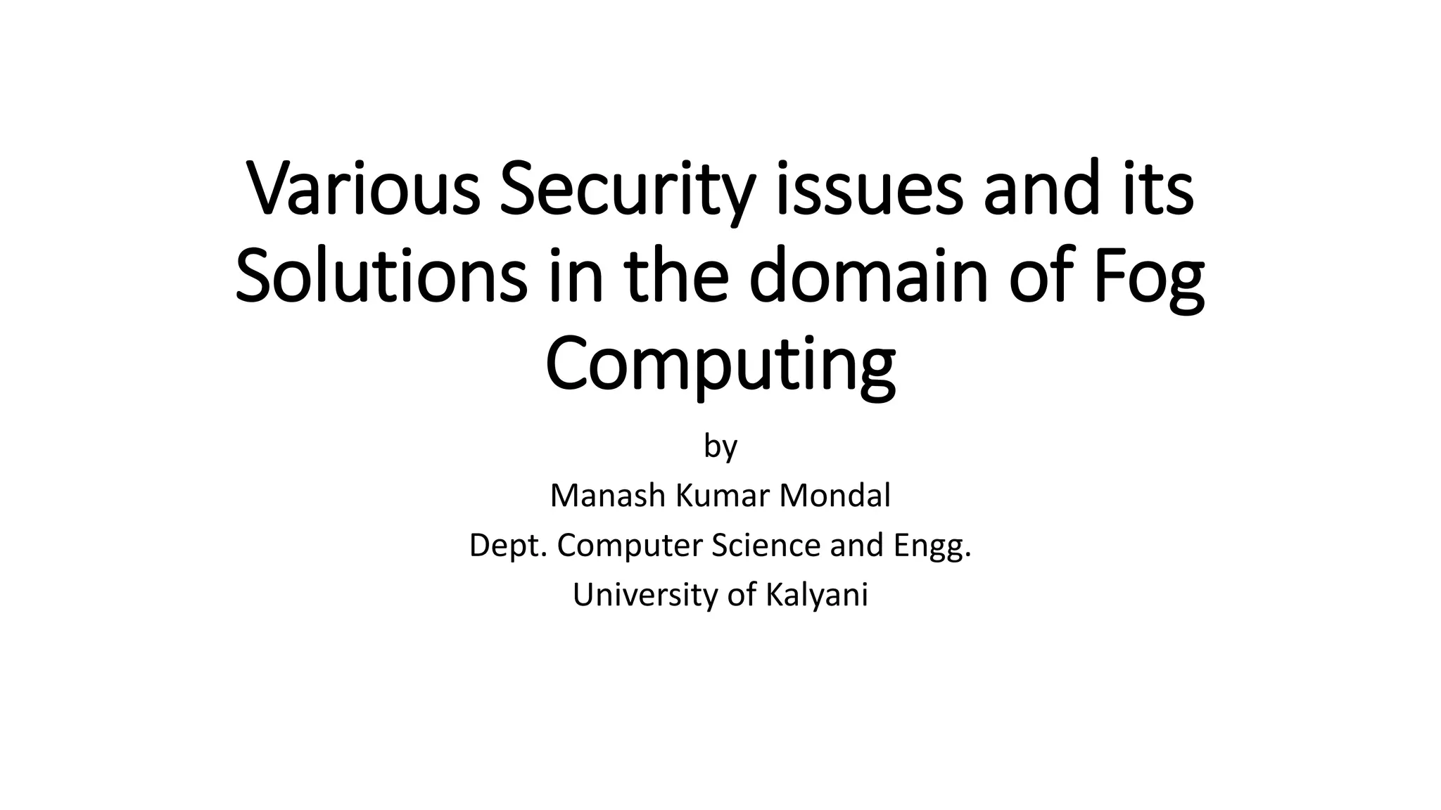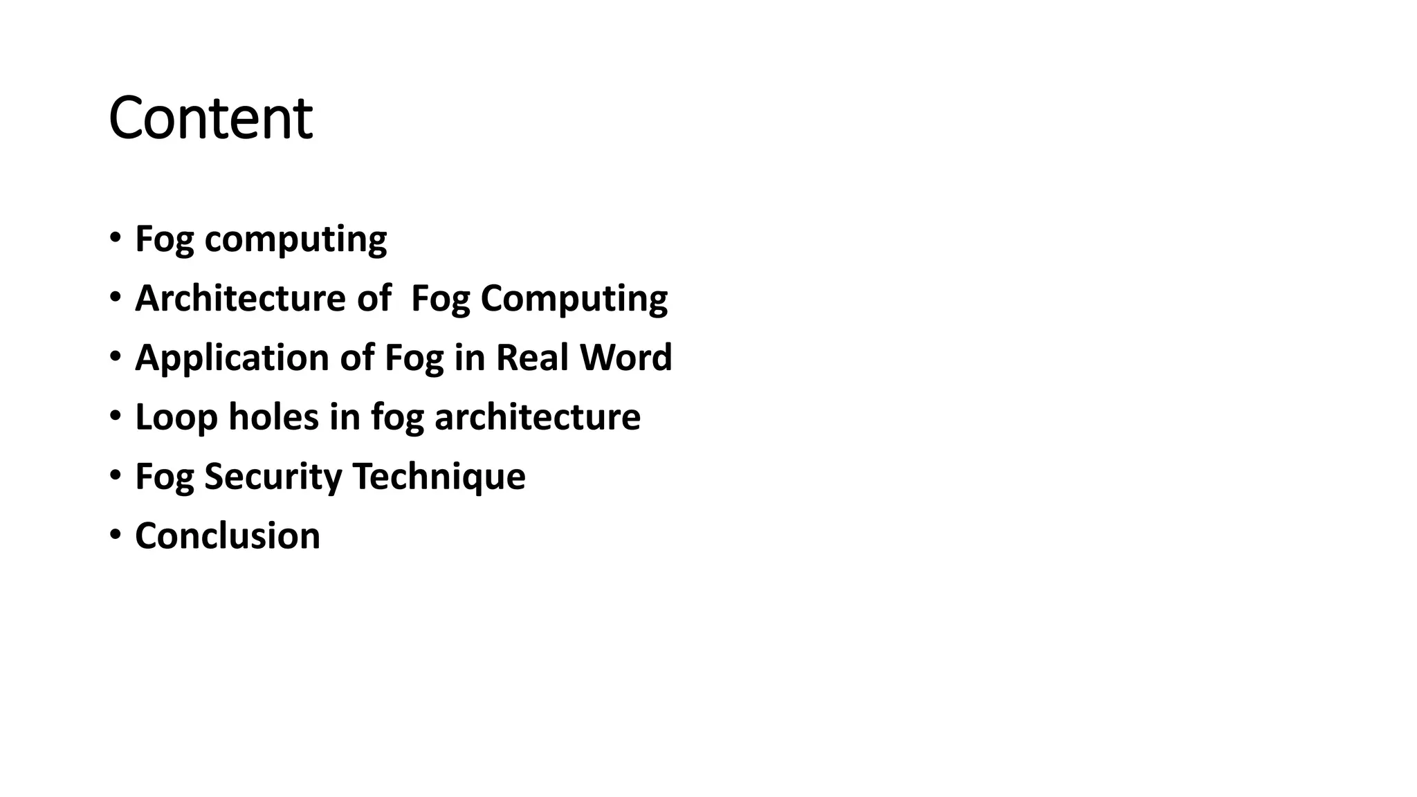 This document discusses security issues and solutions in fog computing. It begins with an introduction to fog computing and its architecture. It then discusses some real-world applications of fog computing like vehicular networks and smart cities. It identifies security loopholes in the fog computing architecture like information injection and denial of service attacks. It also outlines some fog security techniques and concludes by emphasizing the need to address security issues in fog computing.