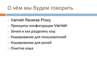 Документ описывает использование Varnish как обратного прокси-сервера для кэширования данных, предназначенных для аутентифицированных пользователей. Основное внимание уделяется конфигурации Varnish через VCL, разделению кэша на основе ролей и пользователей, а также методам очистки кэша. Также рассматриваются примеры кода и настройки для оптимизации работы кэширования с учетом специфики приложения, такого как Drupal.