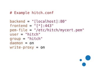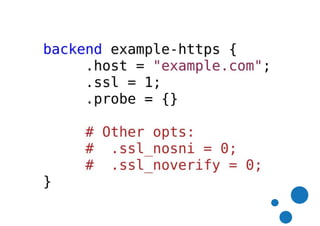 Hitch TLS is a TLS terminator that can be used with Varnish Plus to handle client-side TLS connections. It provides a fast and scalable TLS termination solution. Varnish Plus also supports TLS to the backend by adding ".ssl = 1" to the backend definition. Both solutions provide high performance TLS handling. Future improvements to Hitch TLS and backend TLS in Varnish Plus are ongoing to improve configuration flexibility and add features like OCSP stapling.