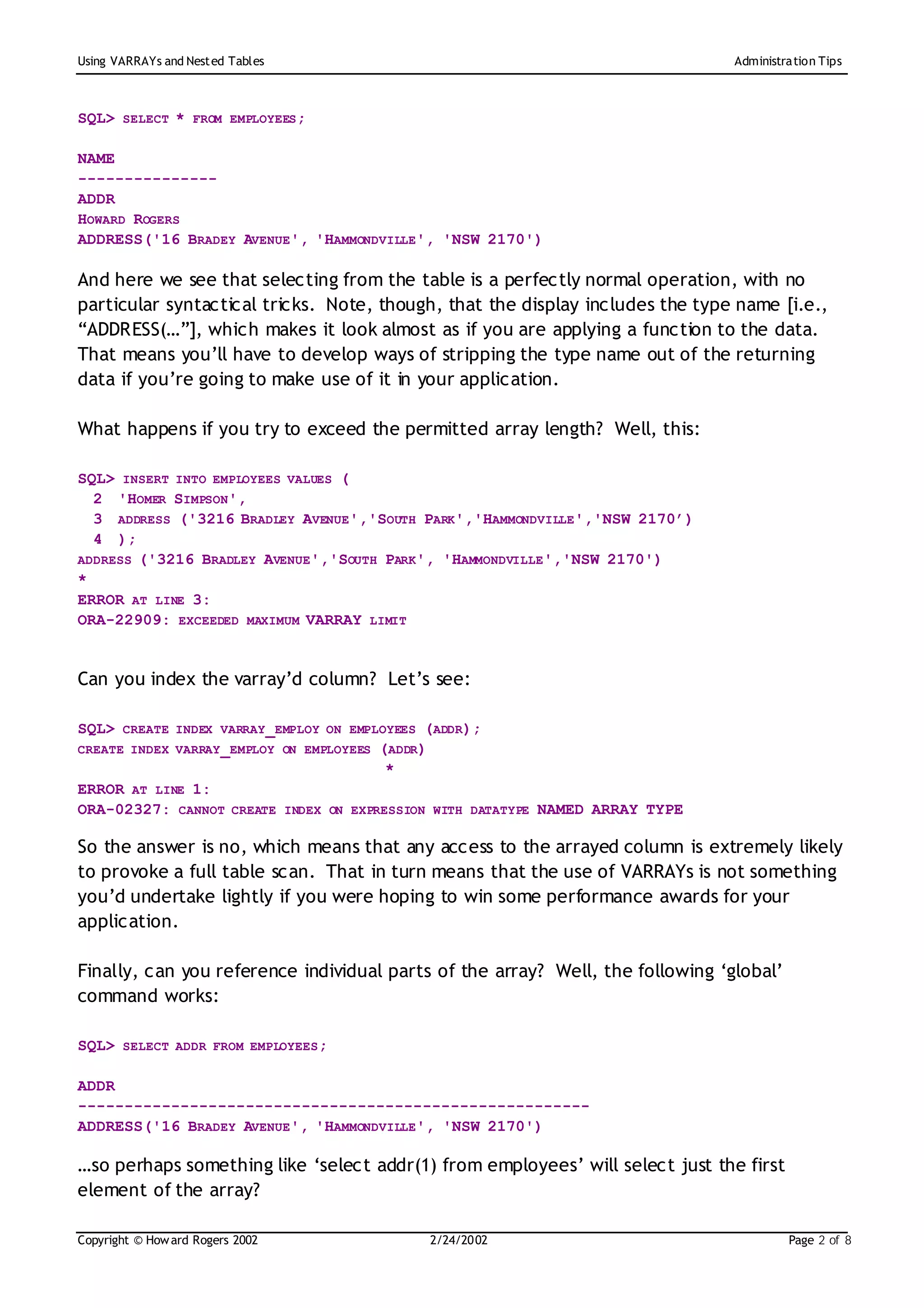 The document discusses the use of varrays and nested tables in database administration, highlighting their usage for storing multiple related entries as a single object. While varrays allow for some flexibility in storing data, they come with significant limitations such as fixed size and difficulties in updating individual elements. In contrast, nested tables are more flexible and allow for separate updates and indexing, but they present management challenges and potential performance issues due to their complexity.