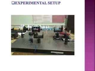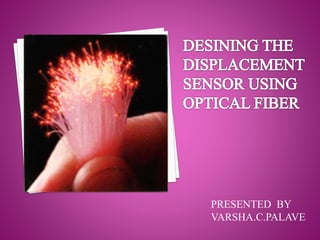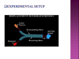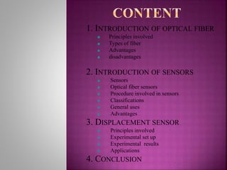 This document discusses optical fibers and fiber optic sensors. It begins with an introduction to optical fibers, including their principles, types, advantages and disadvantages. It then discusses fiber optic sensors, including their components, classifications, and uses. It focuses on displacement sensors, explaining their principles, experimental setup, results and applications. Displacement sensors can be designed using glass or plastic optical fibers with different numbers of fibers, and their sensitivity depends on the fiber material and number of fibers used.