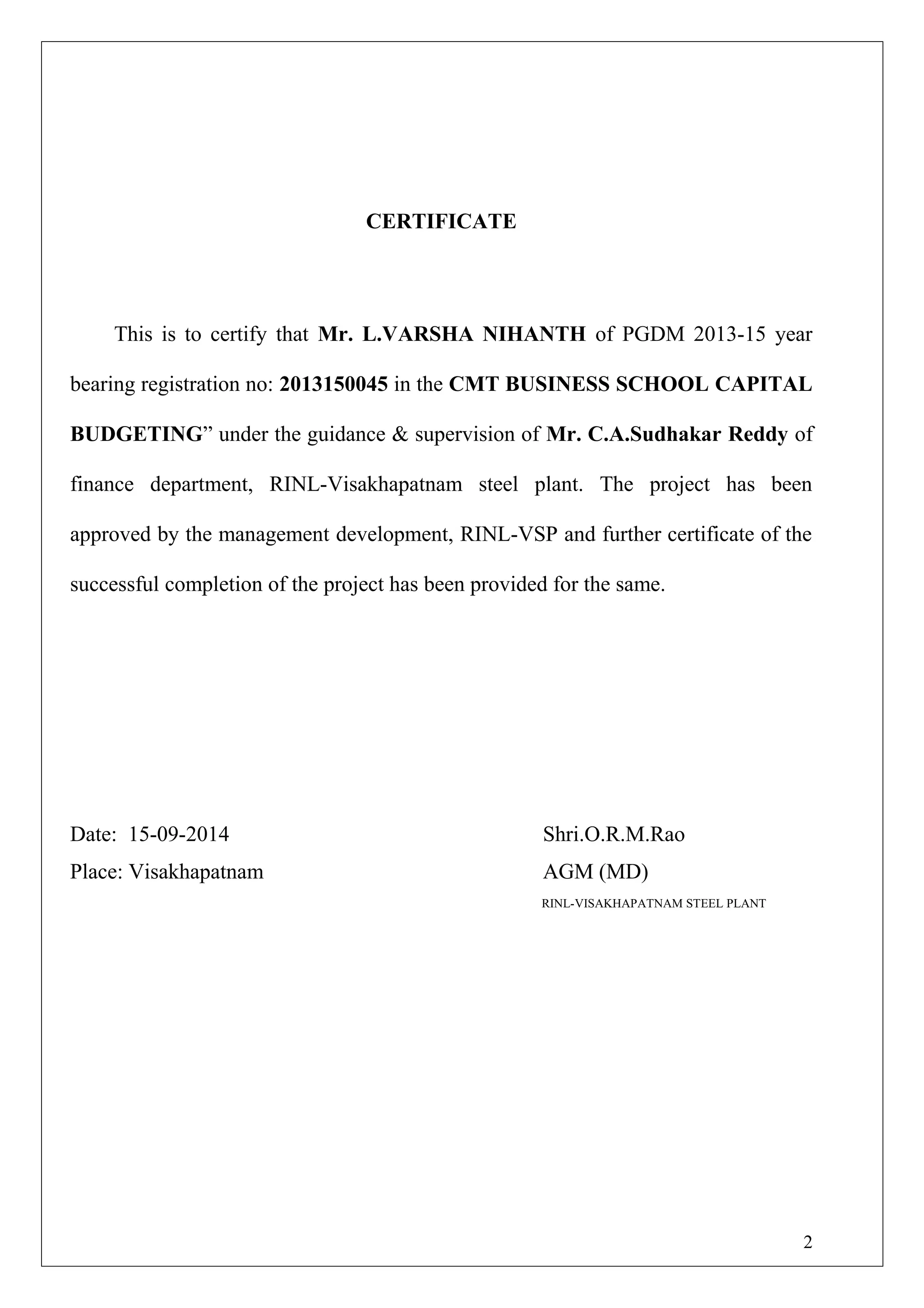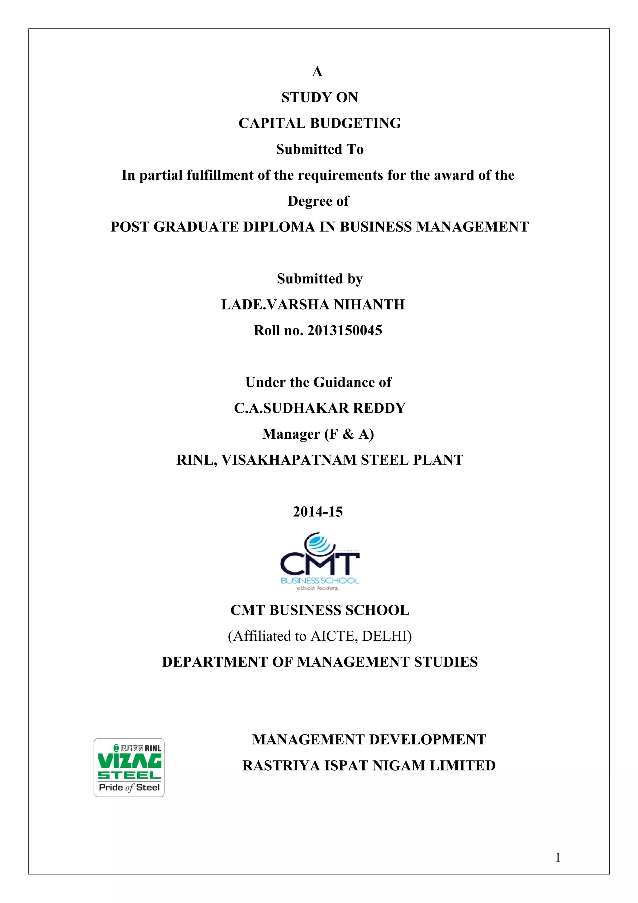 This document provides an overview of a study conducted on capital budgeting at Visakhapatnam Steel Plant in India. It includes an introduction describing the need, objectives, scope and methodology of the study. It also discusses limitations of the study. Chapter 2 provides an industry profile of the steel industry in India and its growth. The study aims to evaluate investment proposals using capital budgeting techniques and provide suggestions to management.