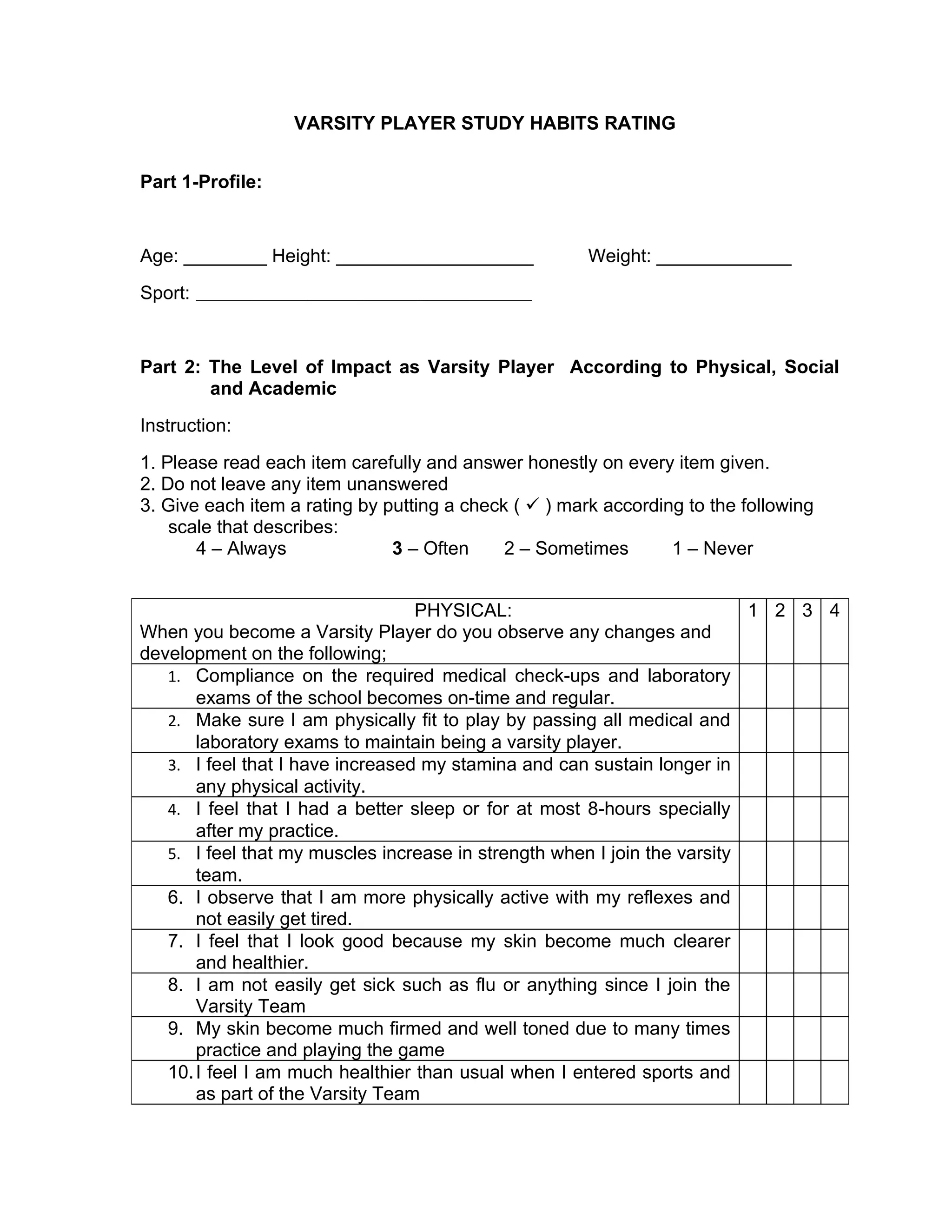 The document is a survey that asks varsity players to rate the impact being on a varsity team has had on them physically, socially, and academically. Players are asked to rate 10 statements in each category on a scale of 1 to 4, with 4 being "Always" and 1 being "Never". Physically, it addresses things like increased stamina, strength, health, and sleep. Socially, it covers confidence, social activities, friends, and exposure. Academically, it focuses on balancing schoolwork with practice and games, maintaining grades, concentration, and valuing studies. The survey collects data on the multifaceted effects of participating in varsity sports.