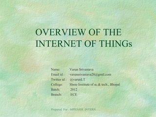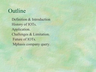 This document provides an overview of the Internet of Things (IoT). It defines IoT as physical objects embedded with sensors and connectivity to exchange data. The document discusses the history and introduction of IoT, its applications in various fields like transportation and healthcare, challenges around security and privacy, and the promising future of IoT in daily life and industries. It expresses the author's interest in an internship to gain practical knowledge of IoT and help companies grow in this emerging field.