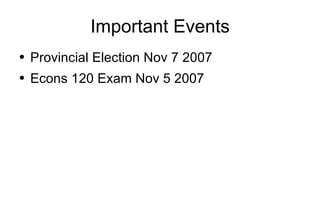 The document lists two important upcoming events: a provincial election scheduled for November 7, 2007 and an Economics 120 exam scheduled for November 5, 2007. It provides the dates for these events but does not include any other details.