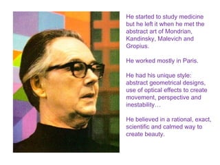 Victor Gabriela, who studied medicine before embracing abstract art, developed a unique style featuring abstract geometrical designs and optical effects to suggest movement. He participated in the 1965 'Responsive Eye' exhibition, which encouraged active viewer interpretation through his technique called cinetisme. Gabriela was a precursor to op art and utilized various mediums while maintaining a minimal use of forms and colors.