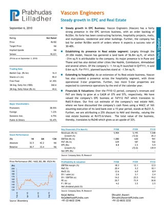 Vascon Engineers has seen steady growth in its EPC and real estate businesses. The company has an order backlog of Rs32 billion in its EPC business, constructing various types of buildings. It also has a land bank of 56.8 million square feet, with plans to launch 1.5 million square feet in FY11. Vascon is extending into hospitality as well, operating 3-star hotels with more 5-star properties expected by year-end.