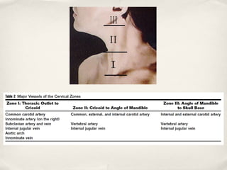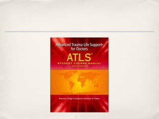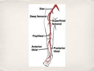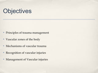 This document discusses vascular injuries, covering their mechanisms, recognition, and management. It begins with the objectives of understanding trauma management principles, vascular anatomy, and mechanisms of injury. For management, the document outlines the ABCDE primary survey, resuscitation to control bleeding and protect airways, and secondary survey. It then details the specific mechanisms of penetrating, blunt, blast, and iatrogenic vascular injuries. The document concludes by discussing principles of vascular repairs, options for peripheral repairs, and potential complications.