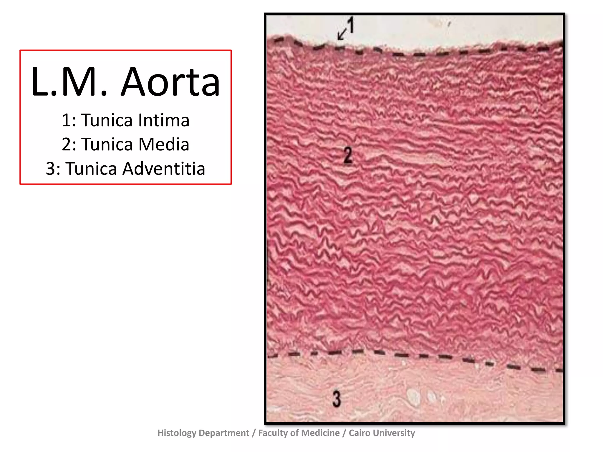The document describes slides from the Histology Department of Cairo University's Faculty of Medicine. It examines a large muscular artery (L.M. Aorta) under the microscope and identifies its three tunics or layers - the tunica intima, tunica media, and tunica adventitia. A second slide notes the presence of numerous elastic fibers in the tunica media of the aorta. A third slide examines a medium-sized artery and vein under the microscope.