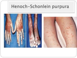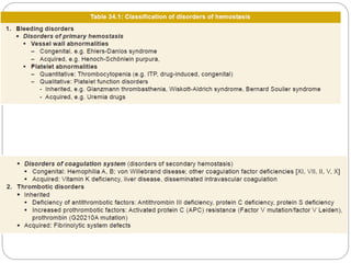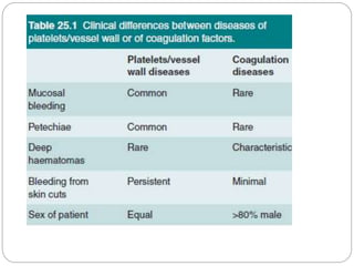 This document discusses bleeding disorders caused by vascular defects. It defines different types of hemorrhages including petechiae, purpura, and ecchymoses. It describes acquired vascular disorders such as senile purpura, scurvy, and vasculitis. Inherited disorders discussed are hereditary hemorrhagic telangiectasia and Ehlers-Danlos syndrome. The diagnostic approach for vascular purpuras is outlined.