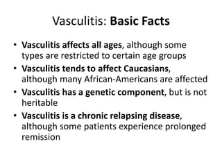 Vasculitis refers to inflammation of blood vessels. It affects people of all ages and can be chronic and relapsing in nature. Vasculitis is classified based on the size of blood vessels involved, such as large, medium, or small vessels. Diagnosis involves ruling out other conditions through biopsies and tests. Treatment aims to induce remission through immunosuppressants, while monitoring focuses on preventing damage to organs. Even in remission, patients commonly experience pain, fatigue, and long-term consequences from both the disease and its treatments.
