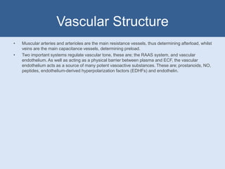 Vasoactive drugs act on vascular smooth muscle to cause vasoconstriction or vasodilation. Vasoconstrictors such as endothelin, angiotensin II, and ADH cause contraction through increasing calcium levels or sensitivity. Vasodilators such as calcium channel blockers, ACE inhibitors, and nitrates cause relaxation through decreasing calcium, increasing cGMP/cAMP, or inhibiting phosphodiesterases. The vascular endothelium releases various mediators like prostanoids, nitric oxide, and C-type natriuretic peptide that regulate vascular tone. RAAS activation leads to vasoconstriction and sodium retention through angiotensin II, while drugs blocking RAAS cause indirect vasodilation.