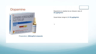 Vasopressors and inotropes are commonly used in the intensive care unit to treat low blood pressure and cardiac dysfunction. This document discusses the physiology and clinical use of various agents. It defines vasopressors as agents that increase vascular tone and blood pressure, while inotropes increase myocardial contractility. Common vasopressors described include norepinephrine, phenylephrine, vasopressin, and epinephrine. The document outlines key principles for the rational use of vasopressors, such as correcting hypovolemia first, titrating the dose based on blood pressure and organ perfusion targets, and considering an agent's effects on various receptor subtypes. Practical issues are also reviewed