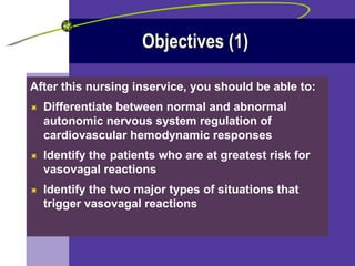 Vasovagal syncope (VVS) is caused by an abnormal response of the autonomic nervous system that leads to a drop in blood pressure and sometimes heart rate. It is triggered by pain, anxiety, or emotional stress and causes feelings of faintness. Those at highest risk include younger patients and those with a history of fainting. Nursing care focuses on recognizing VVS symptoms and treating lowered blood pressure and heart rate by having patients lie down with legs elevated.
