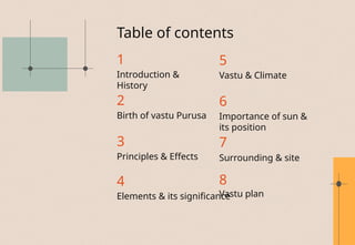 Vastu Shastra is an ancient Hindu architectural science that emphasizes designing buildings in harmony with nature to promote health and well-being. It is based on five elements and the positioning of spaces and structures, considering factors such as sunlight, air flow, and societal functions. The document explores the history, principles, and guidelines for applying Vastu Shastra in architectural planning.