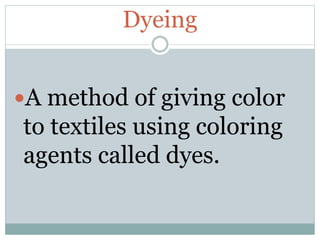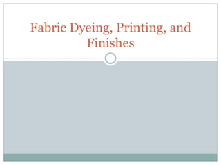 The document discusses fabric dyeing, printing, and finishing techniques, emphasizing the importance of dye selection and various methods such as fiber, yarn, and piece dyeing. It outlines printing techniques like roller, screen, rotary screen, heat transfer, and digital printing, each with distinct advantages and applications. The document highlights the processes and materials involved in achieving desired color effects on textiles.