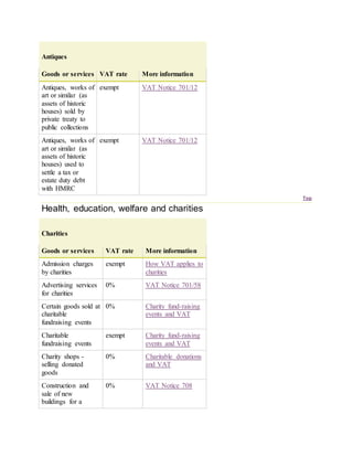 - The document lists various goods and services and the applicable VAT (value added tax) rates in the UK, which can be exempt, 0%, or 5%.