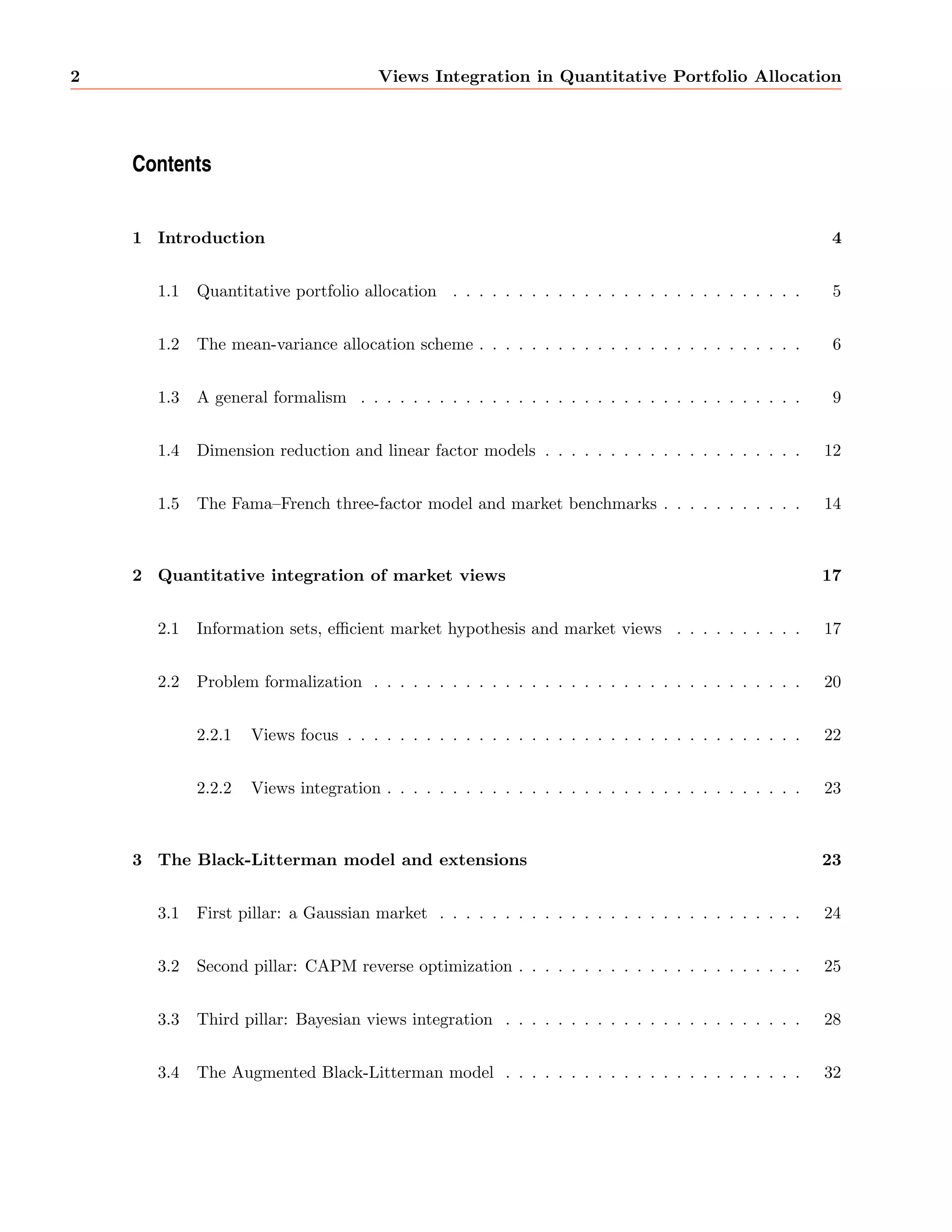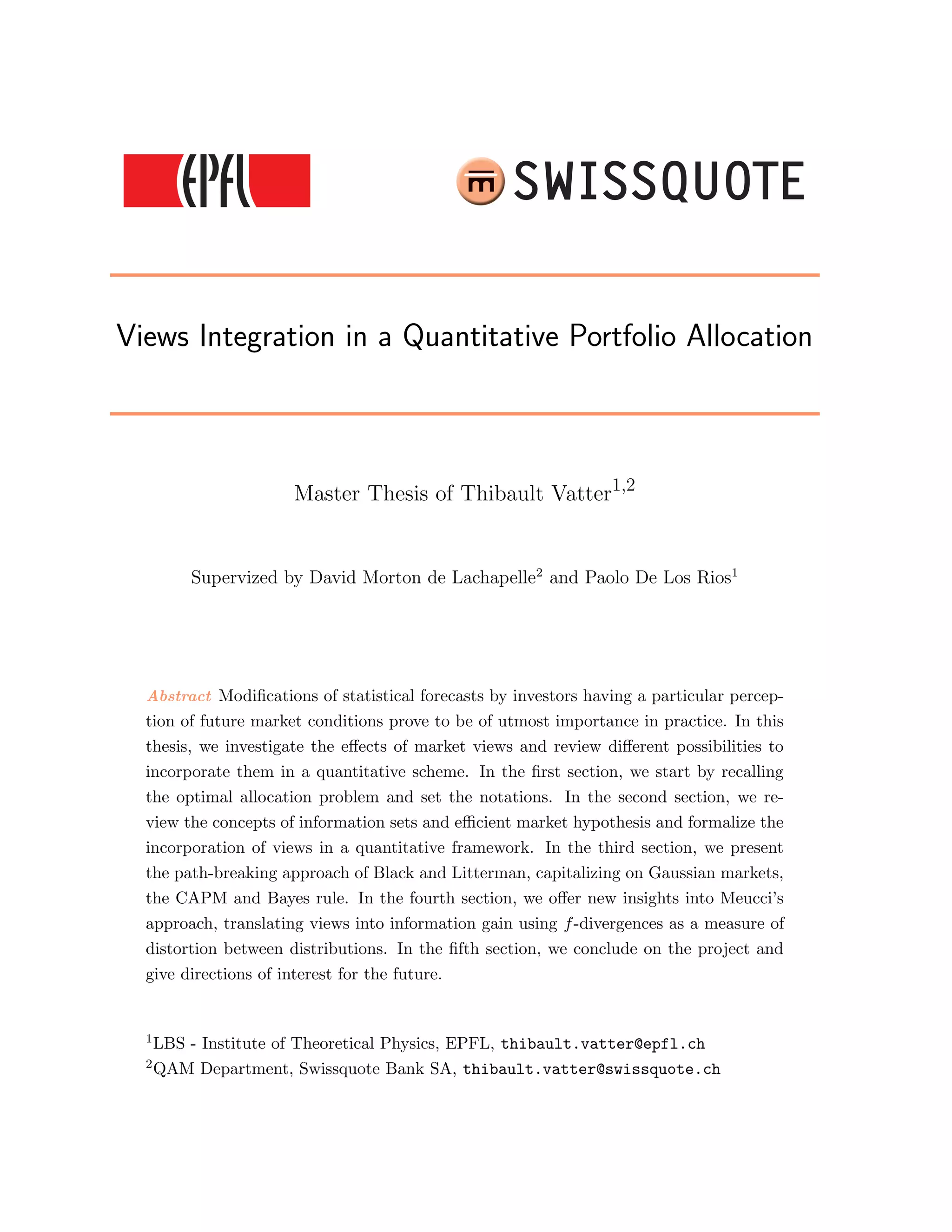 This document summarizes a master's thesis on integrating market views into quantitative portfolio allocation. It introduces the concepts of optimal asset allocation, mean-variance optimization, and dimension reduction using linear factor models. It then discusses incorporating investor views through information sets and the efficient market hypothesis. The Black-Litterman model uses a Gaussian market assumption, CAPM reverse optimization, and Bayesian updating to integrate views. An alternative approach uses f-divergences to measure distortions between probability distributions and translate views into information gain. The thesis concludes by proposing directions for future research.
