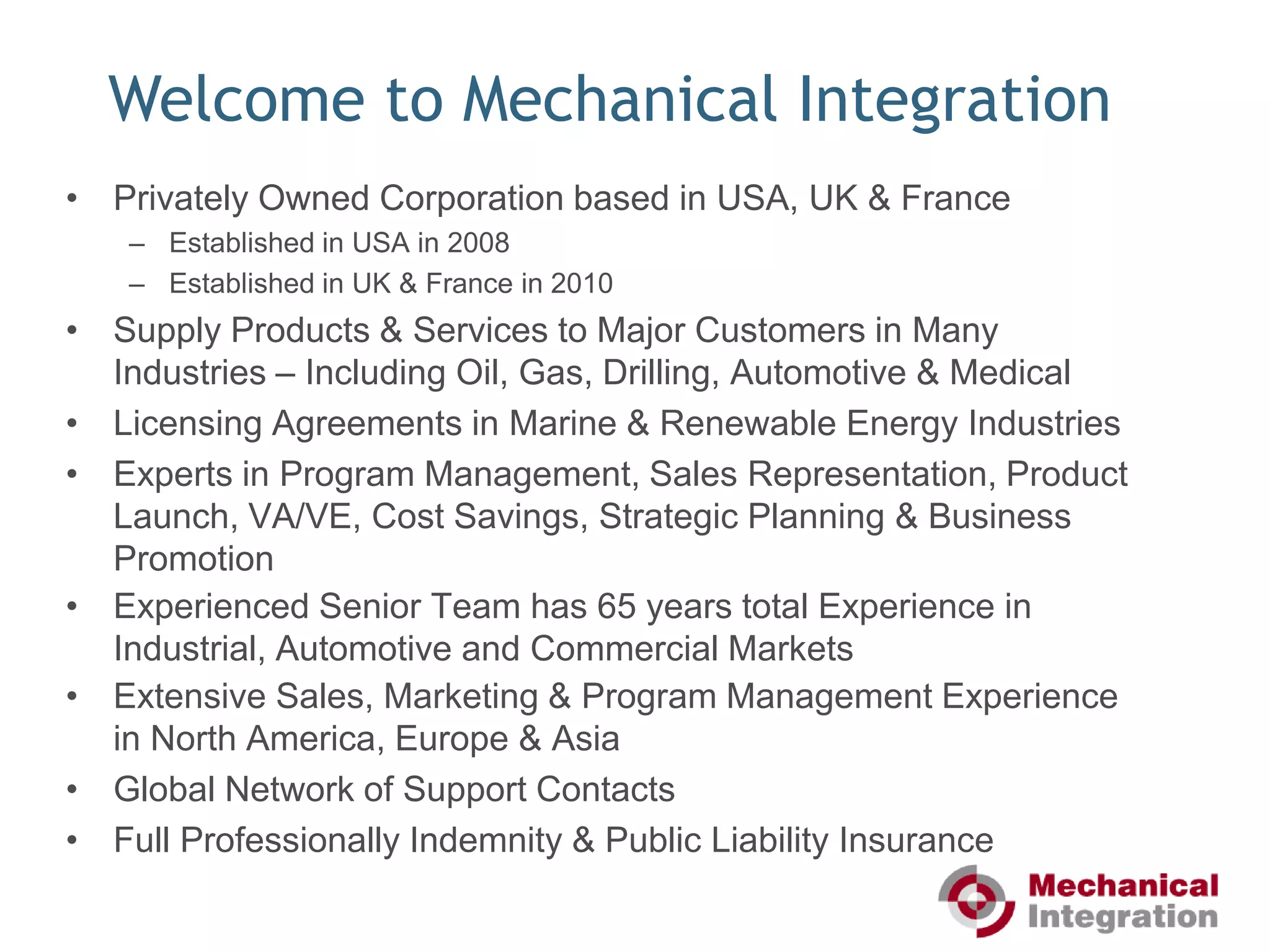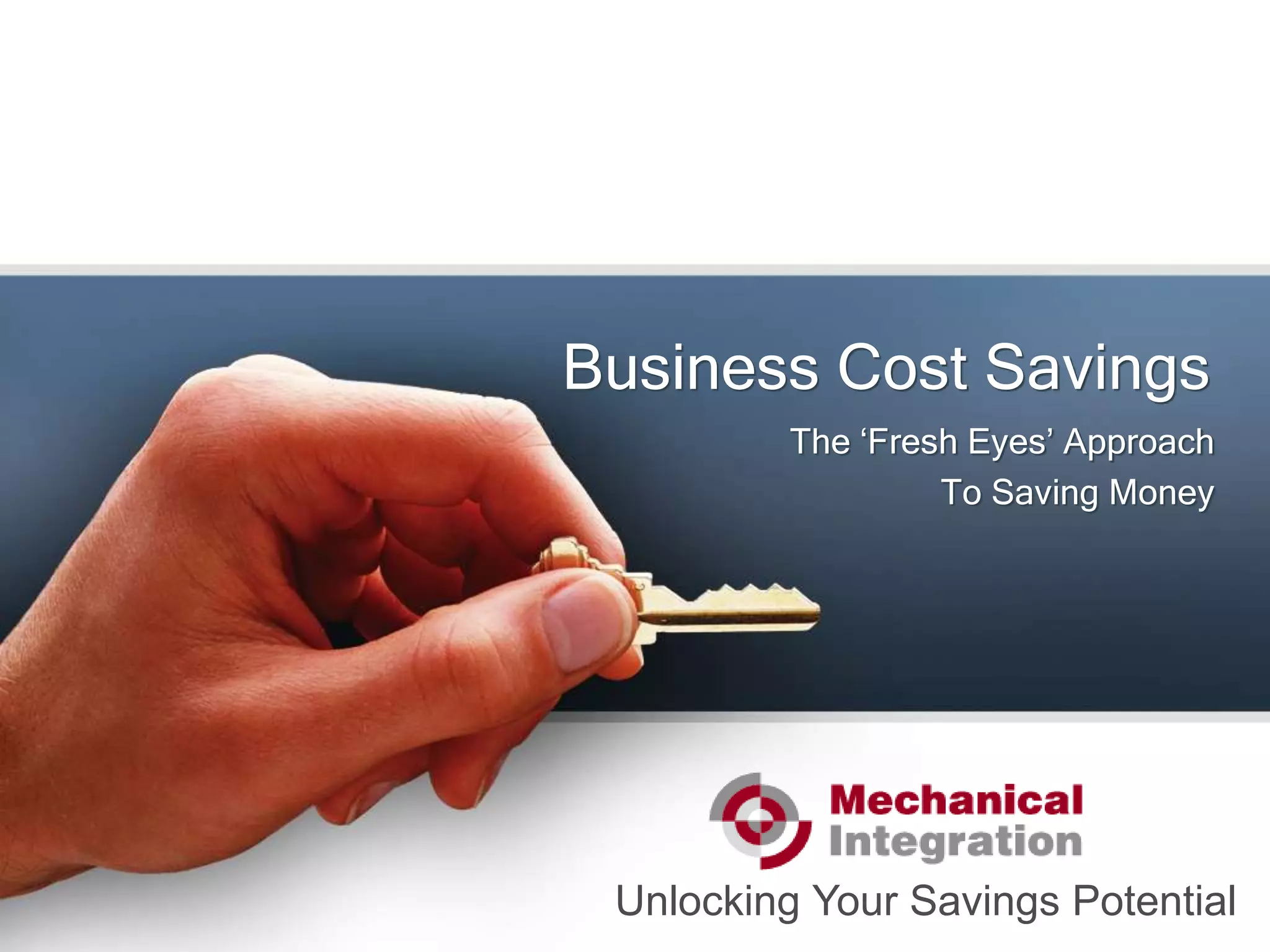 This document discusses cost savings services provided by Mechanical Integration. It was established in 2008 in the US and expanded to the UK and France in 2010. It helps companies eliminate waste, improve efficiency, and create a "savings culture" to prepare for the future. MI takes a "fresh eyes" approach, examining how a company designs, sources, manufactures, and distributes products. It focuses on materials, expenses, and labor costs. MI works with clients to set achievable savings targets, categorize ideas, implement solutions, and realize ongoing savings. Case studies show clients achieving immediate savings of $185,000 and $1.2 million, as well as long term savings of €703,150 and €48,103
