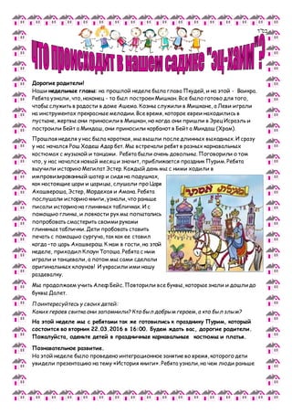 В документе описываются мероприятия для детей, проведенные в рамках недельных глав, включая постройку мишкана и подготовку к празднику Пурим. Дети изучили историю мегилат Эстер, практиковали навыки математики и искусства, а также участвовали в физкультуре и взаимодействии с клоуном. В конце недели было предложено родителям задать детям вопросы о пройденной теме.