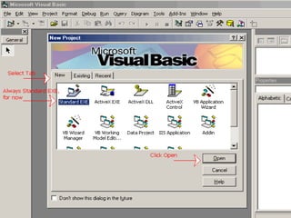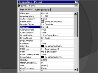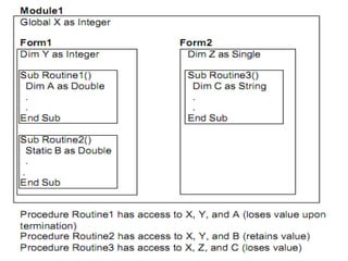 This document provides an overview of the history and development of the Visual Basic programming language. It discusses how Visual Basic originated from the BASIC language in the 1960s and was later adapted for microcomputers by Bill Gates and Paul Allen in the 1970s. Every version of Basic since has been based on their early work. Visual Basic was then introduced by Microsoft in 1991 and continued to be updated with new features and capabilities in subsequent versions like Visual Basic 3.0, 4.0, 5.0 and 6.0. The document also defines some key Visual Basic concepts and terms.