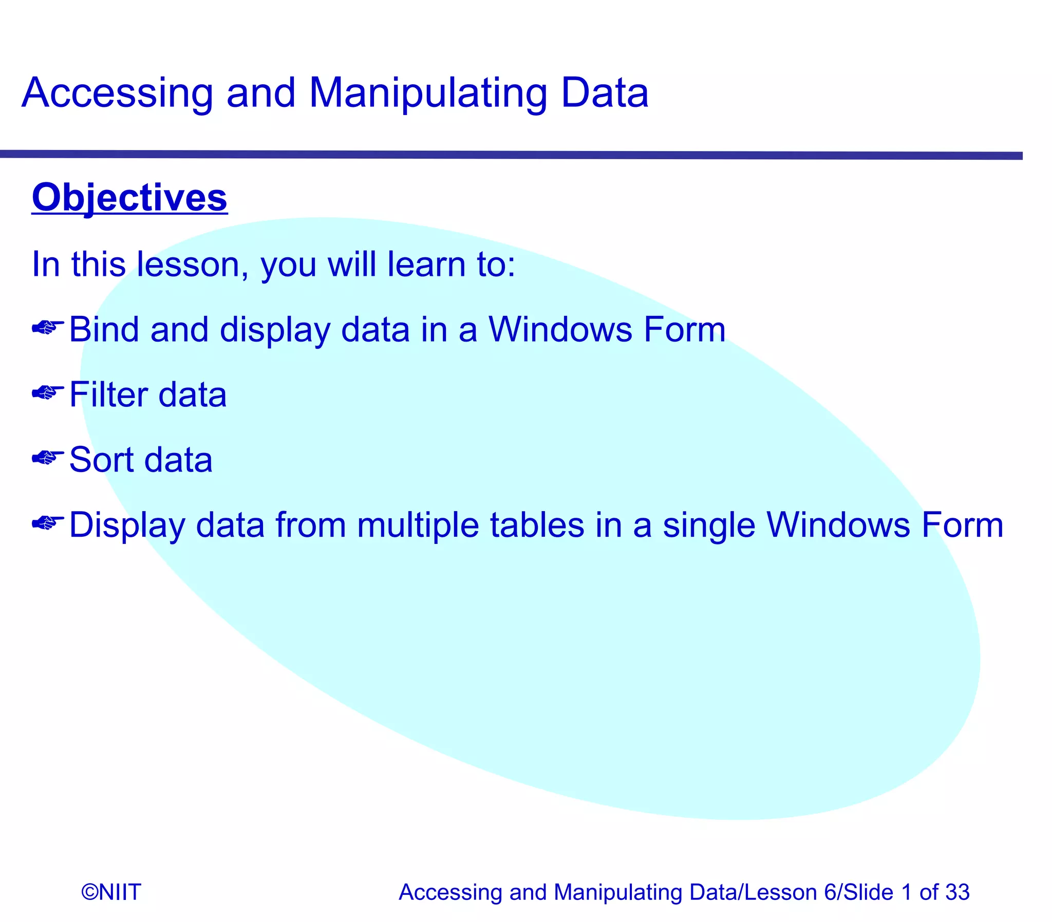 This document discusses accessing and manipulating data in a Windows Form application. It covers binding data to controls, filtering and sorting data, and displaying data from multiple tables. The objectives are to bind and display data, filter data, sort data, and display related data from different tables in one form. Various tasks like identifying data, designing forms, and writing code to connect to a database and bind controls are presented. Navigation through records using the BindingManagerBase class is also described.