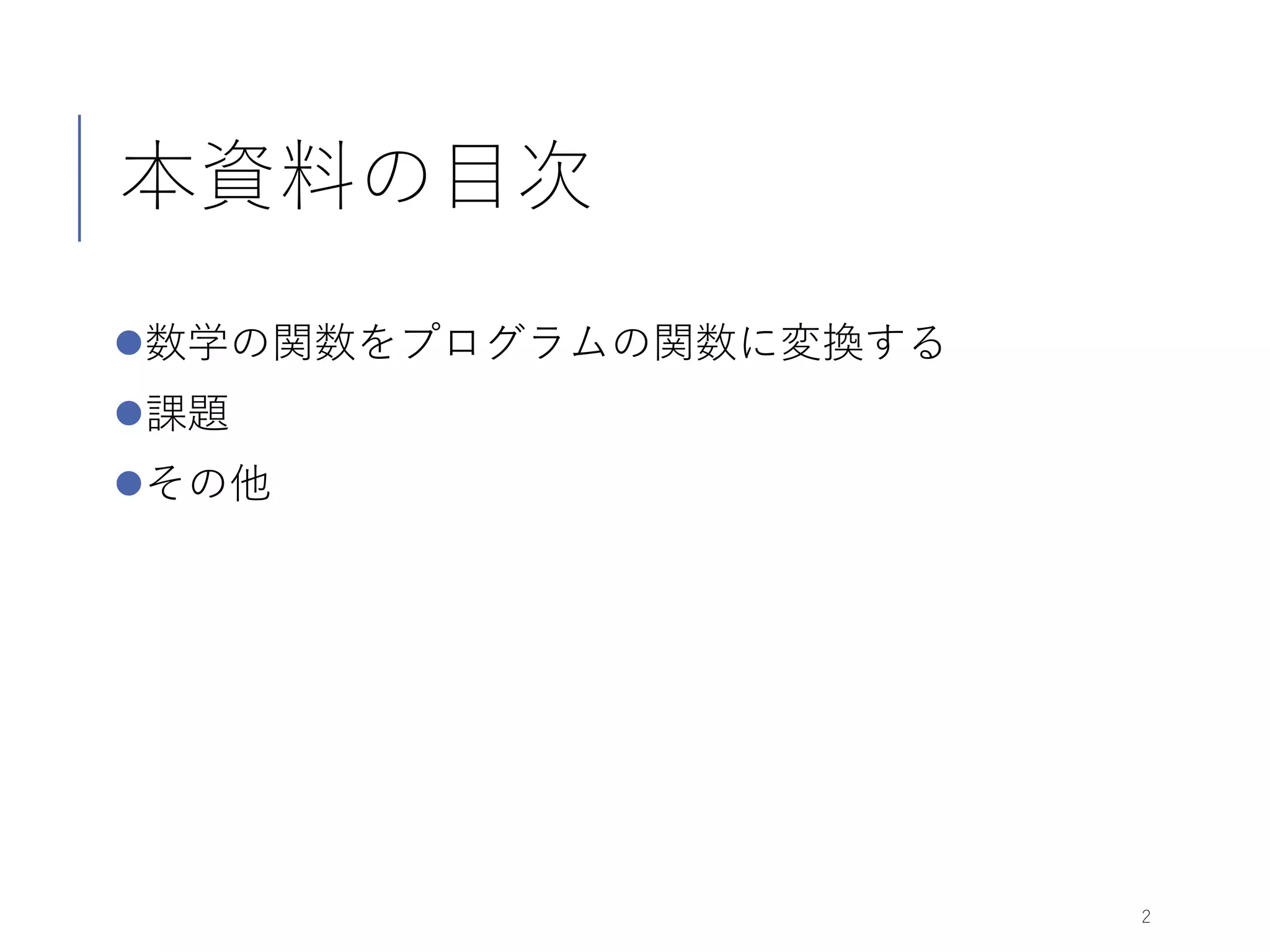 本資料の目次 数学の関数をプログラムの関数に変換する 課題 その他 2