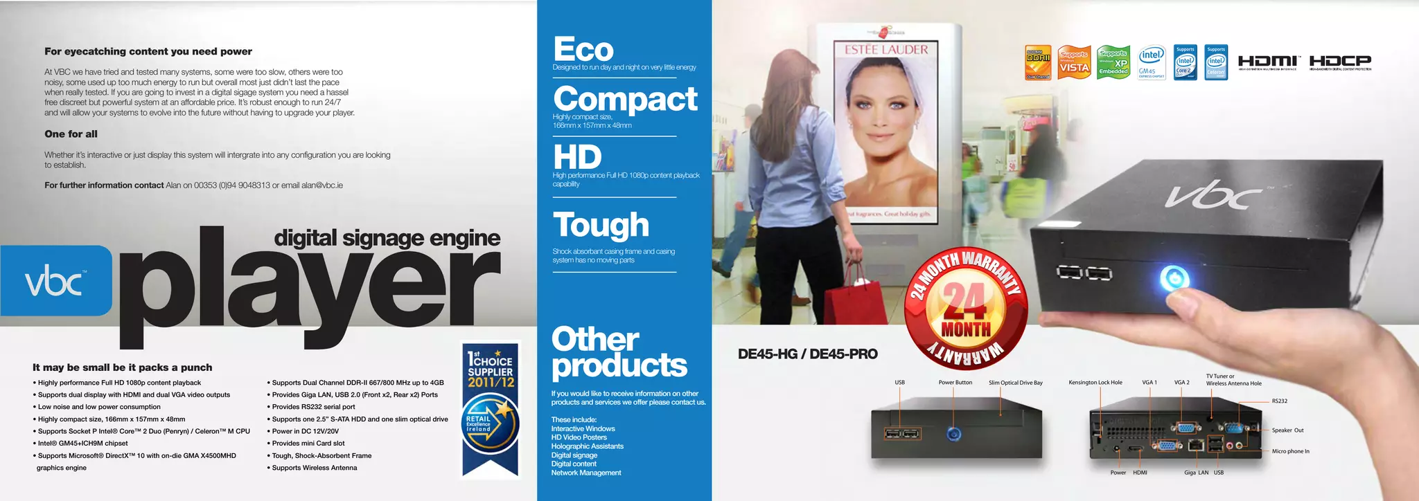 For eyecatching digital signage content, VBC recommends their compact yet powerful digital signage player. It is designed to run continuously on low energy, is discreet but robust enough to run 24/7, and will allow systems to evolve without needing an upgrade. Whether displaying interactive or static content, the system can integrate into any configuration. For more information, contact Alan at the provided phone number or email.