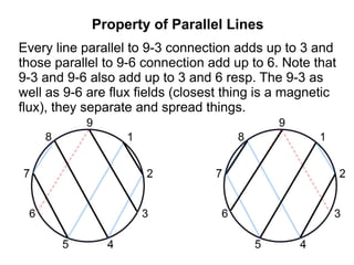 This document provides an overview of the key concepts of Vortex Based Math (VBM). It discusses how VBM can describe all mathematical functions using the digits 1 through 9 and their connections. Properties like doubling, halving, mirroring and reciprocals in multiplication and division are demonstrated. Diagrams show the underlying patterns and relationships between numbers. Family number groups and the roles of 3, 6 and 9 in determining arrangements are also summarized. The document indicates that further research is still needed to more rigorously prove some mappings between rational and irrational numbers in the system.