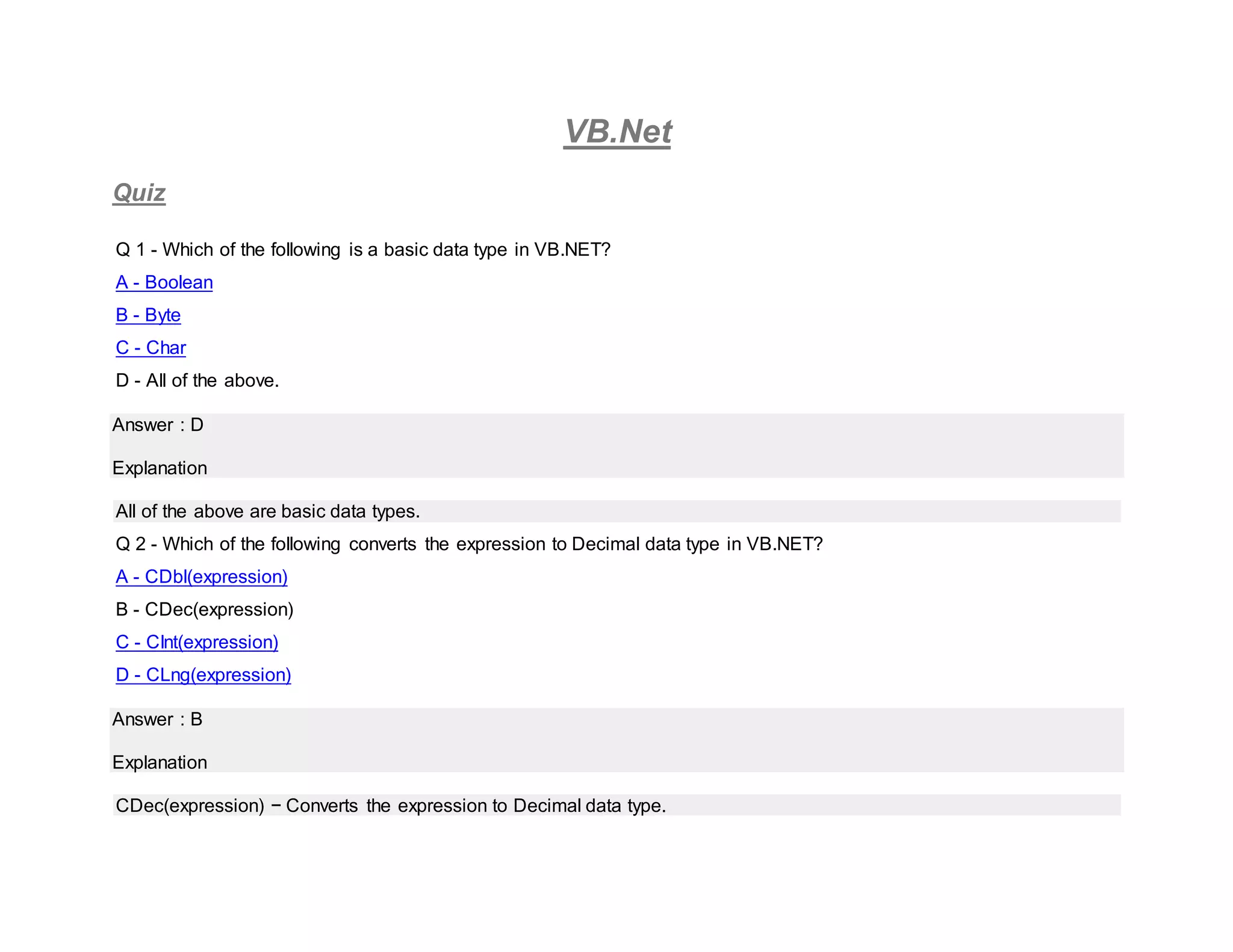 This document contains a 10 question quiz about VB.Net. It asks multiple choice questions about basic VB.Net concepts like data types, type conversion methods, access modifiers, and common statements. The questions cover topics such as basic data types, type conversion, access modifiers like Public and Private, and statements to declare variables, constants, enums, classes and structures.