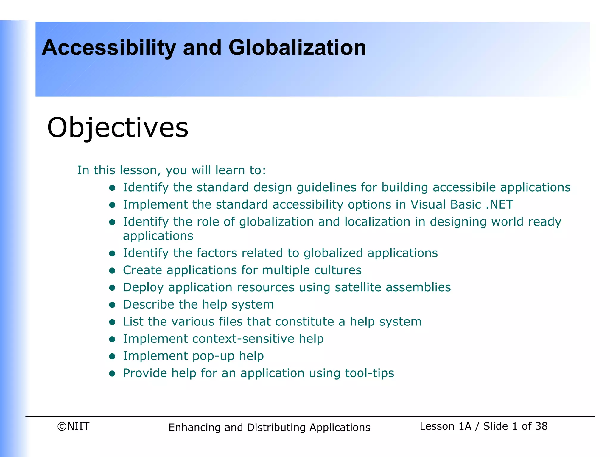 This document discusses accessibility and globalization in application development. It covers guidelines for making applications accessible, including setting standard accessibility options in Visual Basic .NET. It also discusses factors to consider for globalizing applications, such as language, formatting, and user interface issues. Guidelines are provided for developing applications that can support multiple cultures through proper use of culture codes and localization of resources.
