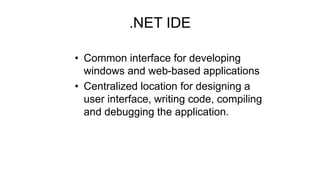 The document discusses the components of a VB.Net IDE, which provides a common interface for developing Windows and web applications from a centralized location. It lists the main components as the Start Page, Windows Forms Designer, Solution Explorer, Properties Window, Toolbox, Server Explorer, Output Window, Task List Window, ClassView Window, and Code and Text Editor Window.
