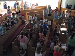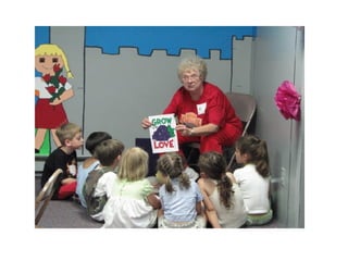 The document summarizes the morning activities at the Second Reformed Church's 2008 Vacation Bible School. It describes the registration process, music and skit time for the kids, snacks being prepared in the kitchen, and activities led by Mike Sicienski and Brenna Raes. The theme for the VBS was based on Galatians 5:22-23 about the fruits of the spirit. Photos showed the morning activities, including sign language and music. Crafts and decorating the classrooms were also mentioned. The summary emphasized the many volunteers that contributed hours to make VBS a fun and meaningful experience for the children.