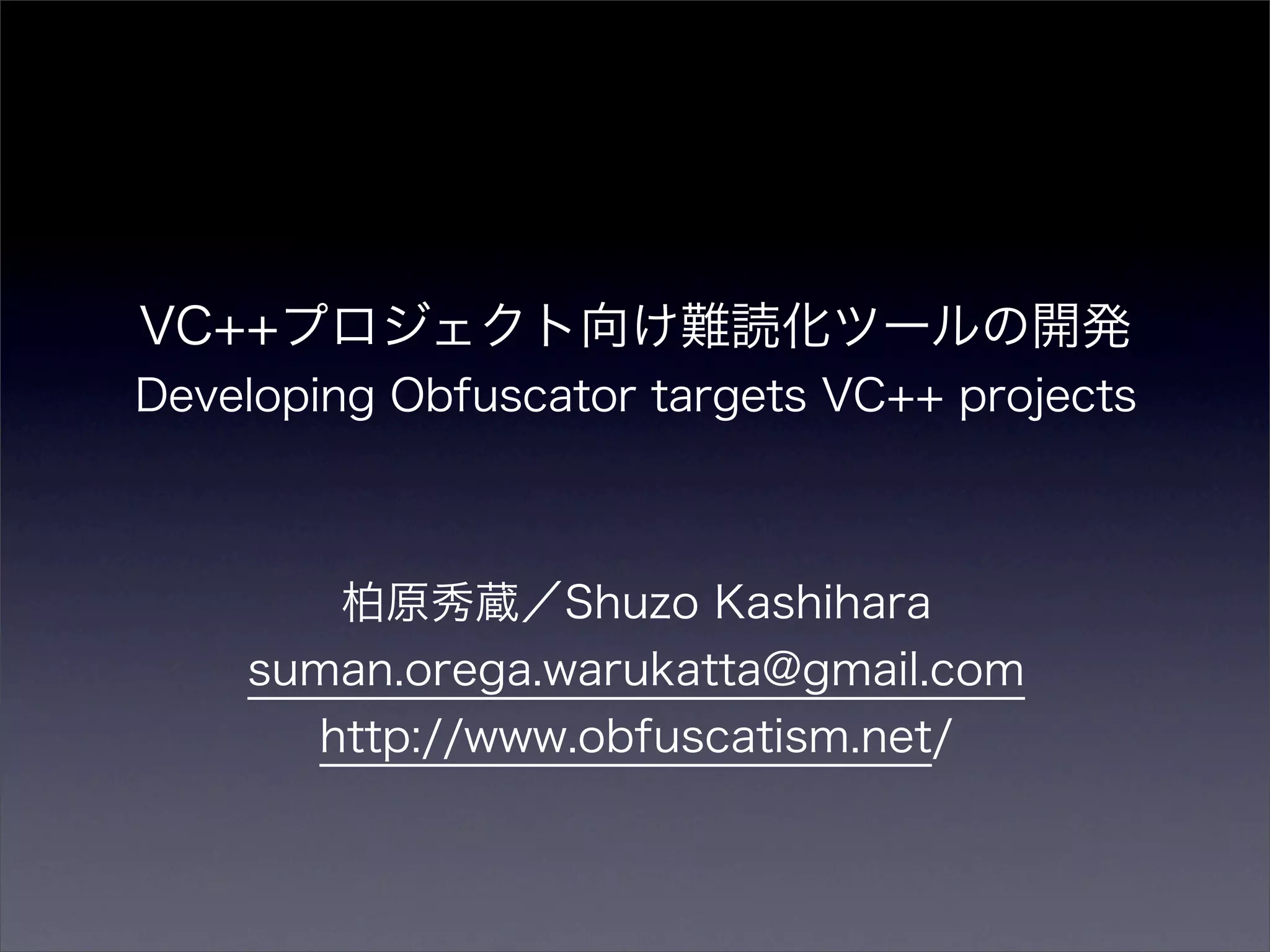 VC++(Visual Studio 2005)のアセンブリソースコード出力を利用した難読化ツールの開発と、難読化の自動化についてのスライド。 AVTokyo 2008の資料です。 http://ja.avtokyo.org/avtokyo2008/speakers