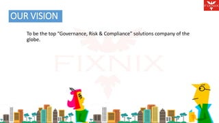 This document summarizes information about FixNix, a Governance, Risk, and Compliance (GRC) solutions company. It outlines FixNix's vision, mission, growth timeline, strategic team members, clients, competitors, target markets, and revenue and expense projections for the first year. Key details include FixNix winning the Microsoft Bizspark challenge in 2012, growing to 20 employees by 2013, and projecting $5.65 million in revenue for the first year with marketing expenses of $360,000.