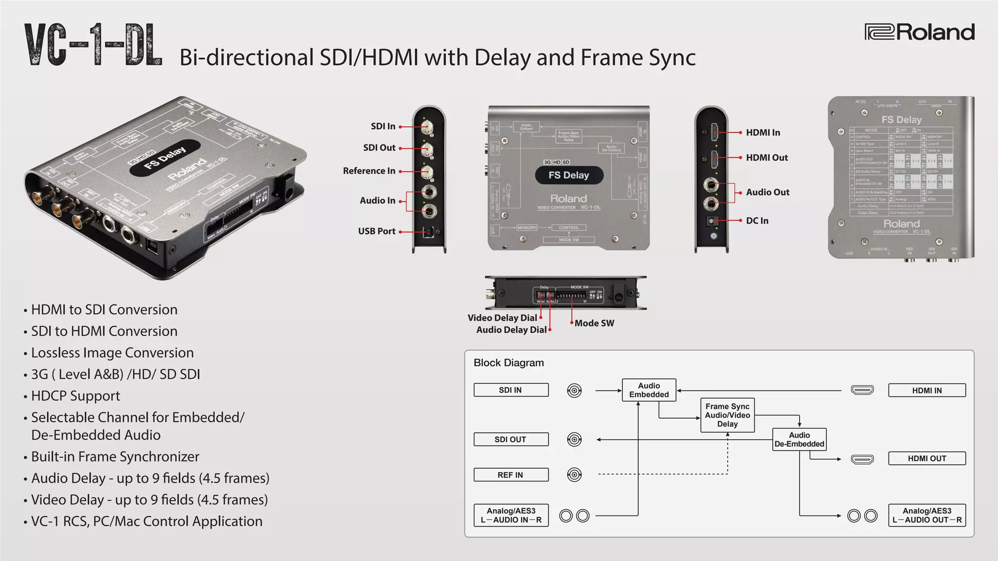 The VC-1 series provides advanced video conversion capabilities, including bi-directional SDI/HDMI conversion with support for various formats and resolutions. It features built-in frame synchronization, audio embedding and de-embedding, and maintains high picture quality without artifacts. The series includes different models like VC-1-DL, VC-1-HS, and VC-1-SC, each designed for specific tasks in video signal management and processing.