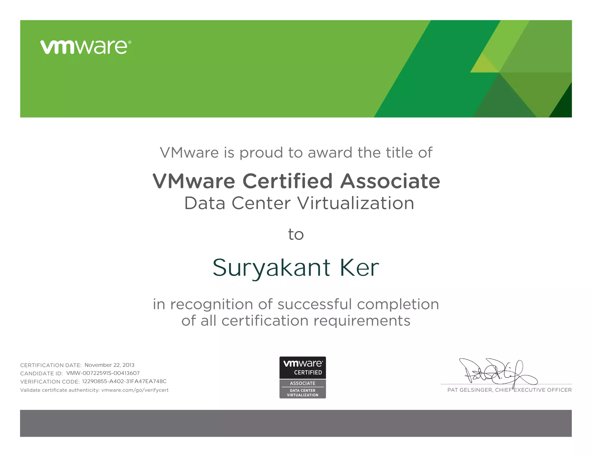 This document certifies that Suryakant Ker has successfully completed all requirements for the VMware Certified Associate - Data Center Virtualization certification. It recognizes his achievement and awards him the title on November 22, 2013. The document is signed by Pat Gelsinger, CEO of VMware, and provides a verification code to validate the authenticity of the certification.